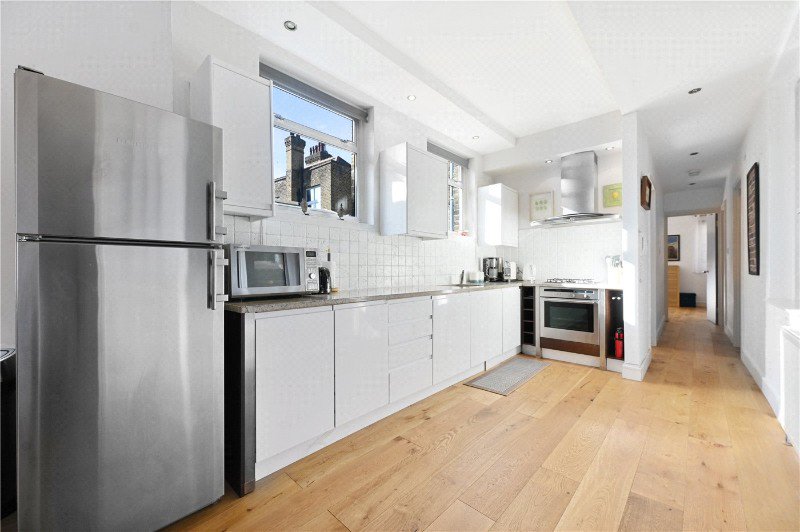 The apartment is centred around an impressive open-plan reception room filled with natural light from large windows on all four sides. Newly installed wooden flooring runs through the principal living areas, complimenting the contemporary kitchen.