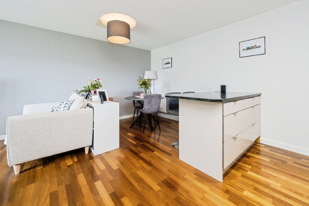 The open plan lounge diner and kitchen offers comfortable living space and is modern and stylish in decor. From the lounge area there is also Juliet balcony doors that open up and overlooks the communal gardens. he modern kitchen has built in appliances and a breakfast bar area which is also great for entertaining and still ample of room for a dining table.