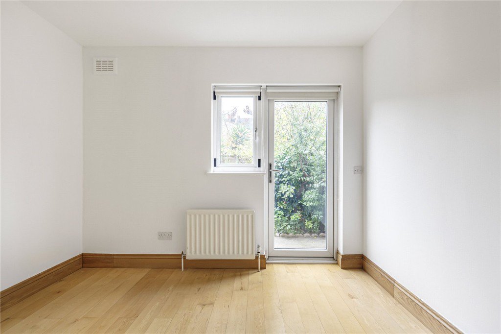 Both bedrooms are generously sized doubles, served by a modern family bathroom. The larger rear bedroom benefits from abundant natural light and direct access to the garden, enhancing the home’s airy and open feel.