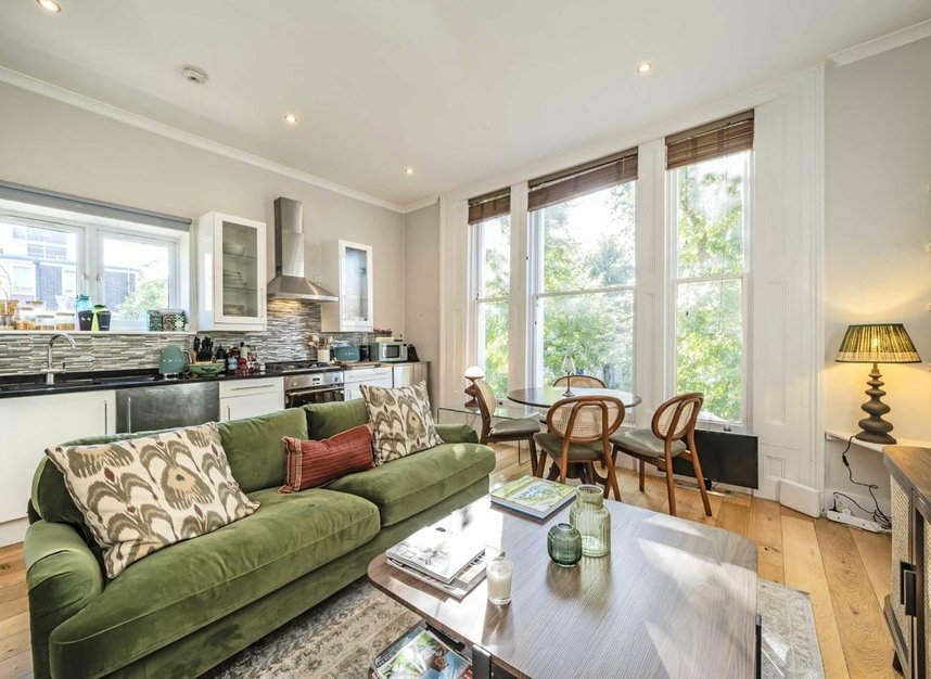 A one bedroom apartment on the first floor of a well maintained Victorian conversion. The property has a dual aspect, open plan reception with a fitted kitchen with plenty of space to dine, high ceilings and solid wood flooring. The large bedroom has custom built in storage and leads on to contemporary bathroom.