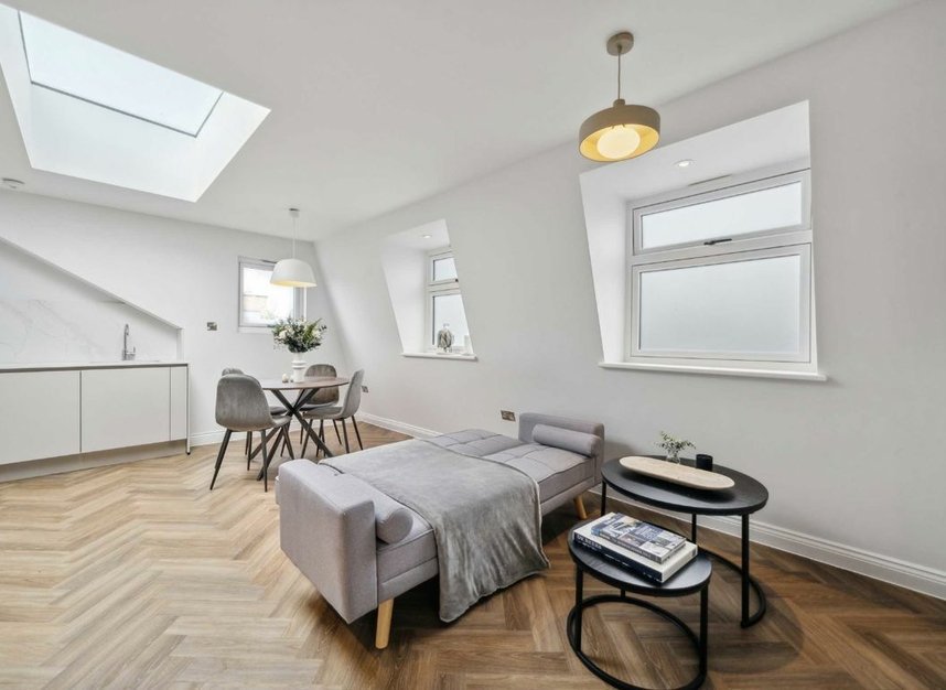 On the top floor of this purpose built Edwardian conversion, is this bright and newly constructed two bedroom apartment that has been redesigned from the brick work out. The property has a large open plan kitchen/living/dining area, with smart heating, an incredible amount of light and an abundance of built in storage; this flat is an incredible turn key ready first home or pied-a-terre.