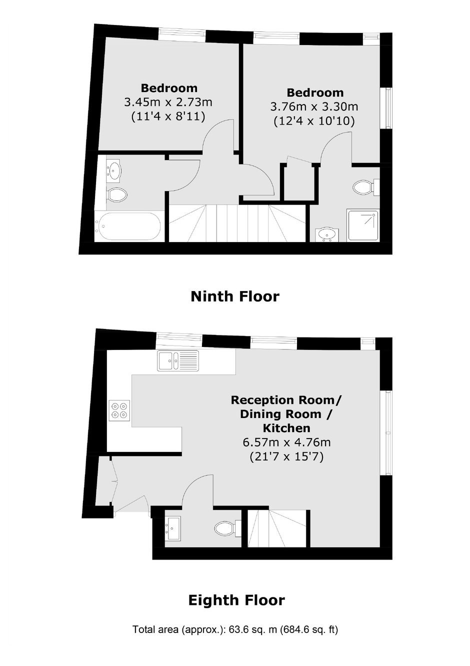 A duplex apartment with a dual aspect. On the 8th floor you have a large kitchen/diner space as well as W.C, up on the 9th floor you will find two double bedrooms and two bathrooms. The property has underfloor heating throughout as well as an air source heat pump.