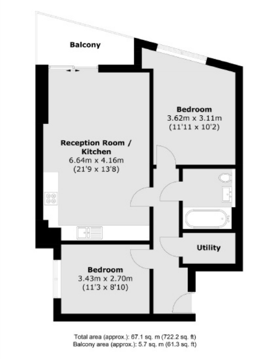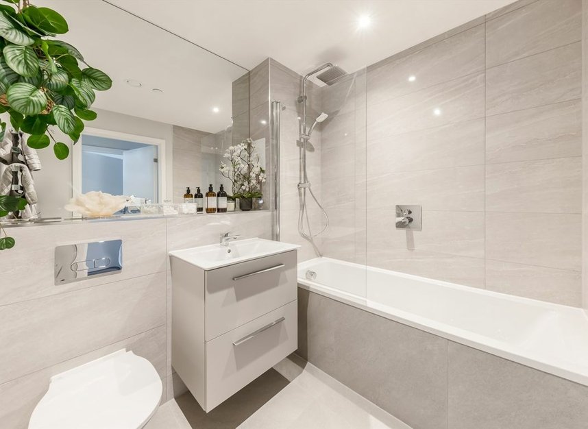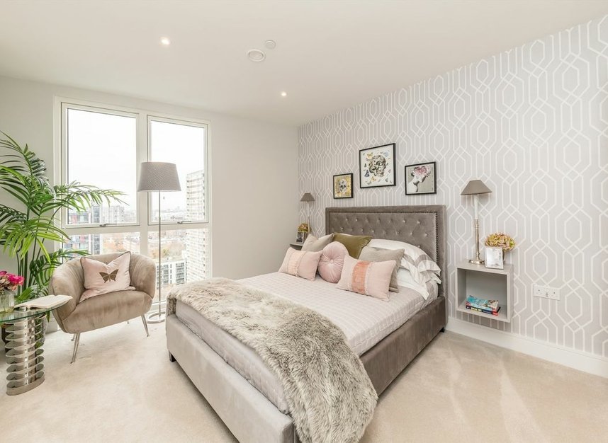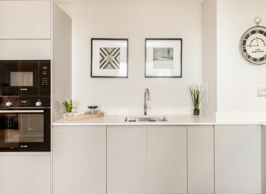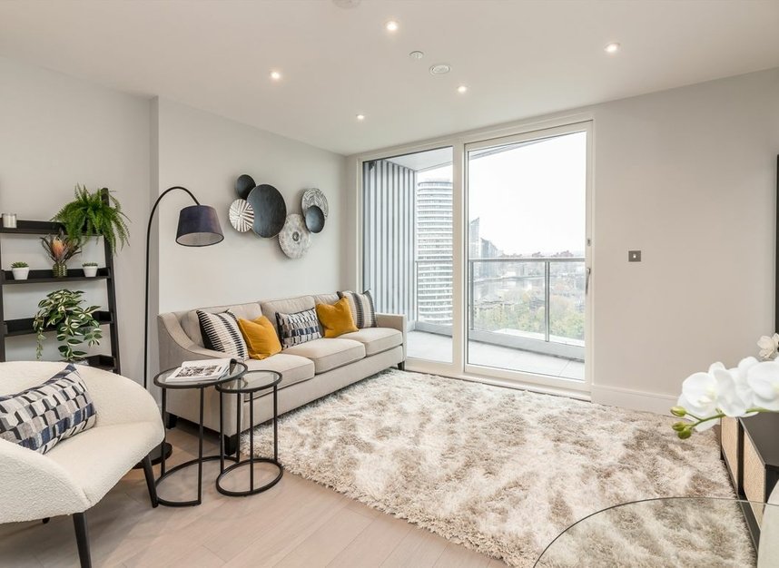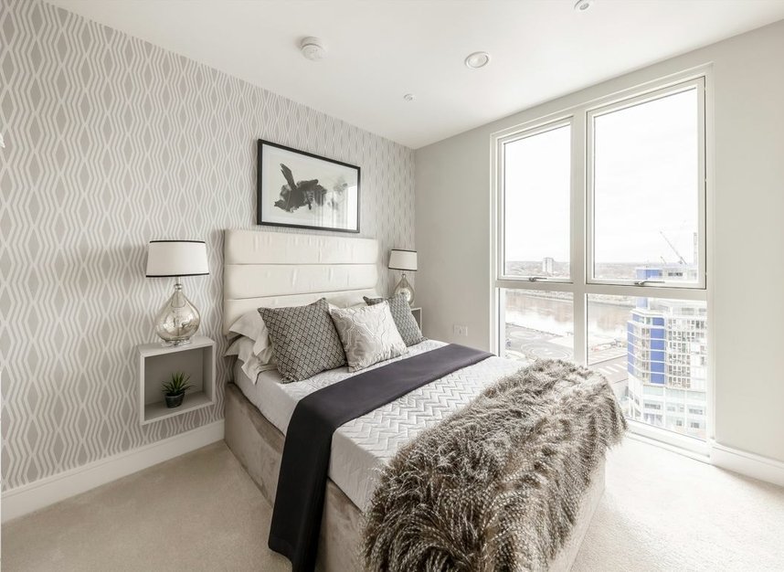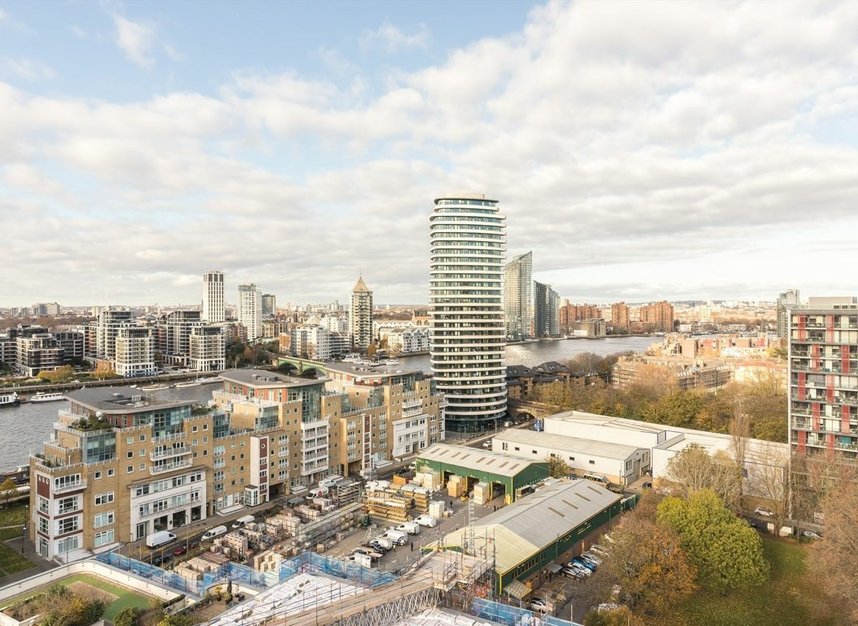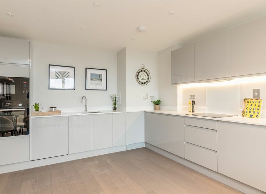 * River View * A lateral two bedroom apartment on the thirteenth floor with a wide balcony. There is a highly energy efficient design including Quooker instant hot water tap, mechanical ventilation system and underfloor heating throughout. There is a communal podium garden as well as a concierge and bike store within the development.