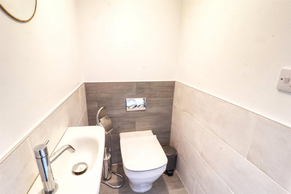 The first floor comprises two generous double bedrooms, both with built-in wardrobes and sliding doors that open directly onto a large south-facing balcony measuring approximately 28ft by 8ft, with breathtaking views across Woolacombe Bay. This level also includes an en-suite bathroom to the master bedroom, fitted with a white three-piece suite including a bath, complemented by a modern tile splashback. Additionally, there is a separate WC, ideal for guest convenience. Practical storage is well thought out with a useful under-stair cupboard and a separate utility cupboard housing the washer/dryer, water heating, and air flow system’