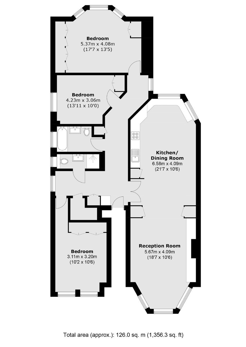 This fully renovated apartment has been finished to an exacting standard throughout and measures in excess of 1350 sq ft. Occupying the entire first floor, with three double bedrooms, bathroom, shower room and a double aspect open-plan living area. The property comes with a share of the freehold and no onward chain.