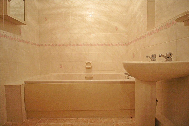 Fitted suite with pedestal wash hand basin, close coupled wc, panelled bath with mixer tap, fully tiled, radiator, shaver point, extractor fan, plastered ceiling
