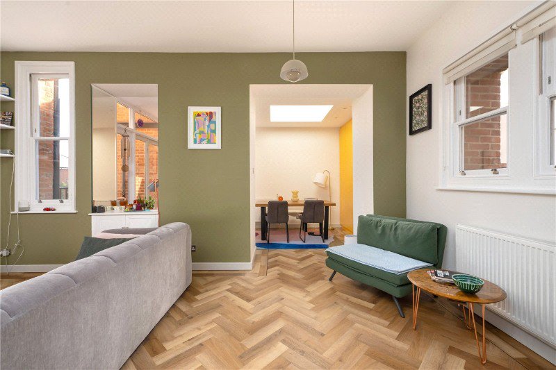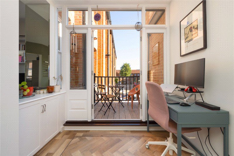 There is an area, which is currently used as a dining area, which has a large lantern window over which bathes this area in light, along with striking coloured full height storage cupboards, and then an office area, which is next to the balcony, so great for getting some fresh air inside.