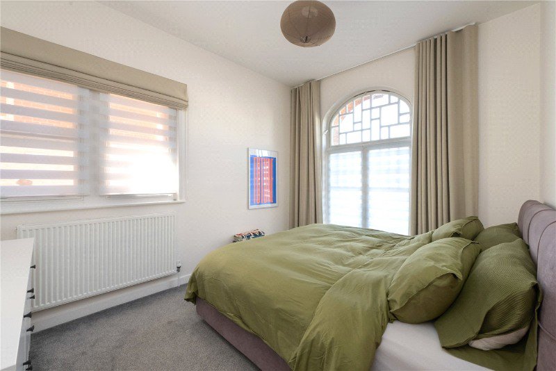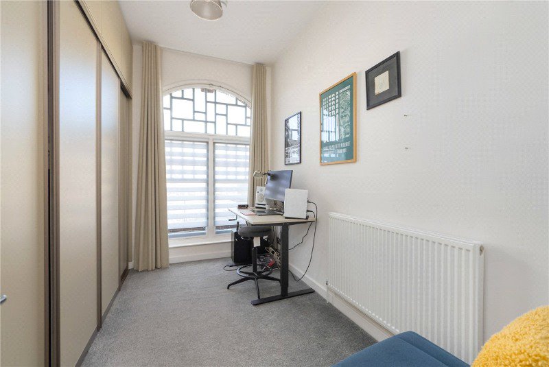 There are two bedrooms in the apartment. The main bedroom has high ceilings and a large window. The second bedroom is currently used as an office and has fitted wardrobes. The bathroom has been fitted with a large shower unit.