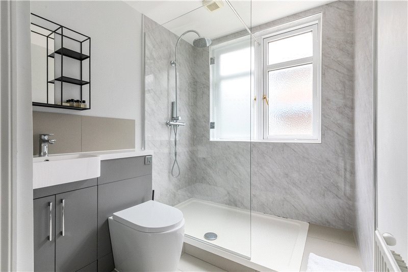 The family bathroom is conveniently located halfway down the hallway; it is a tiled suite with a modern walk in rainfall shower, sink with storage below, radiator, and W.C.