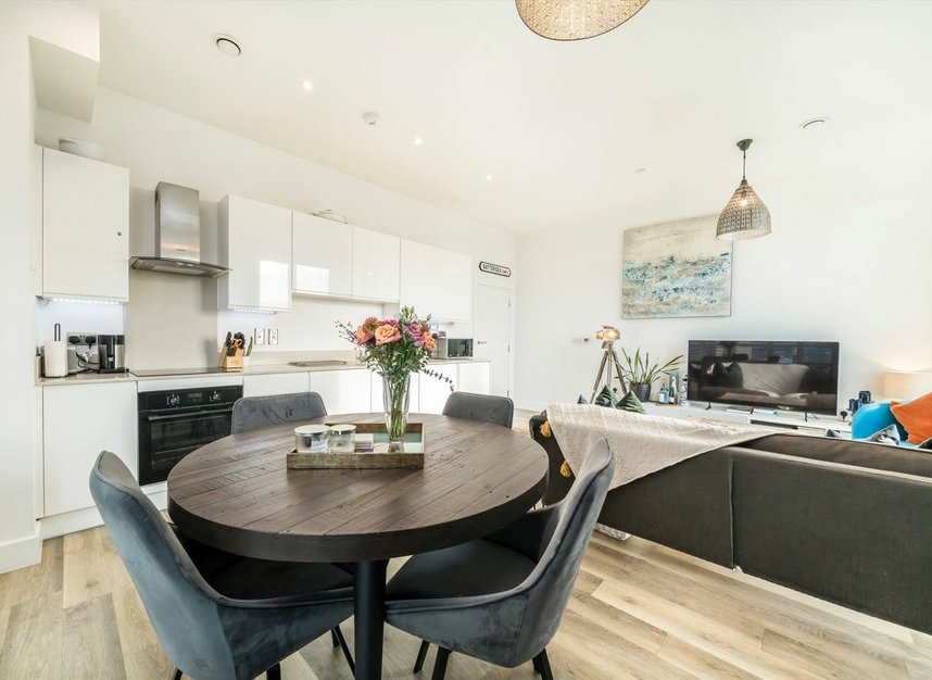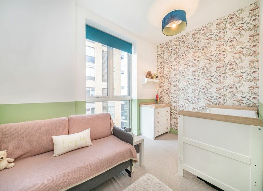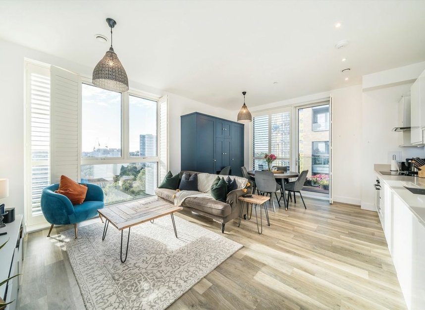 An impressive, top floor, two double bedroom new-build apartment on well-connected York Road, offering a spacious open-plan kitchen, dining and reception area that opens onto a private balcony with far-reaching views across the London skyline. The apartment also benefits from an allocated off-street parking space, access to communal rooftop gardens and has high ceilings.