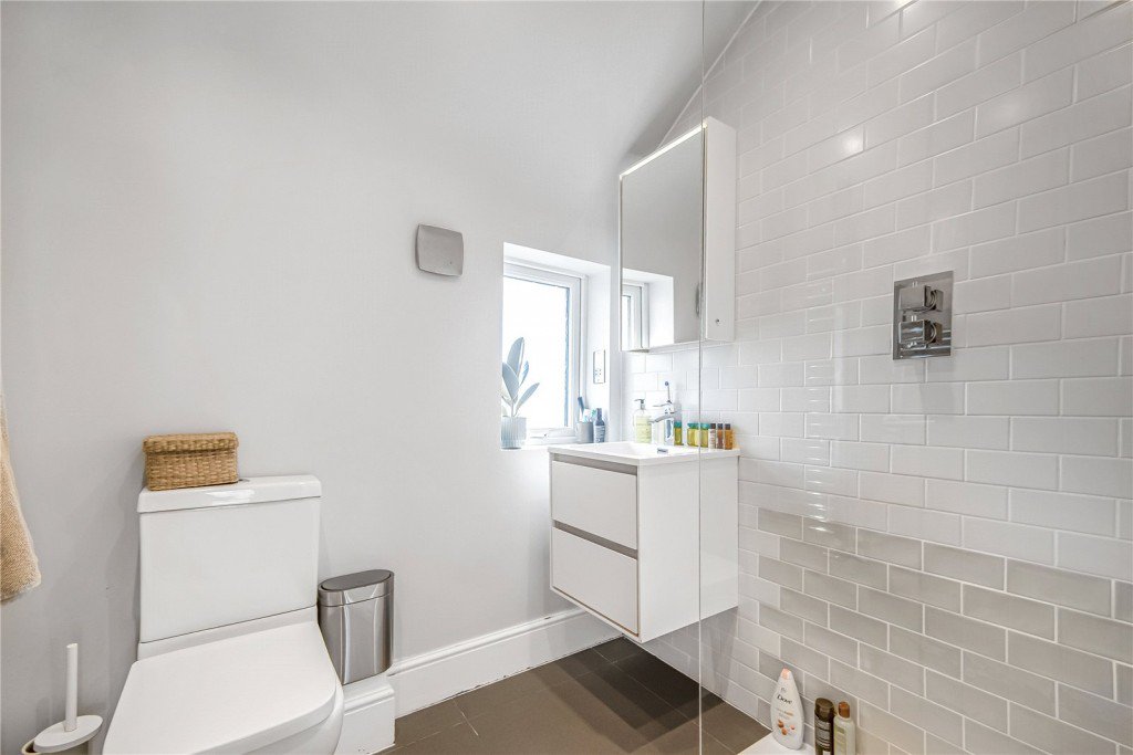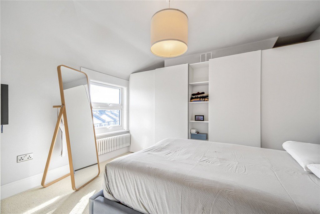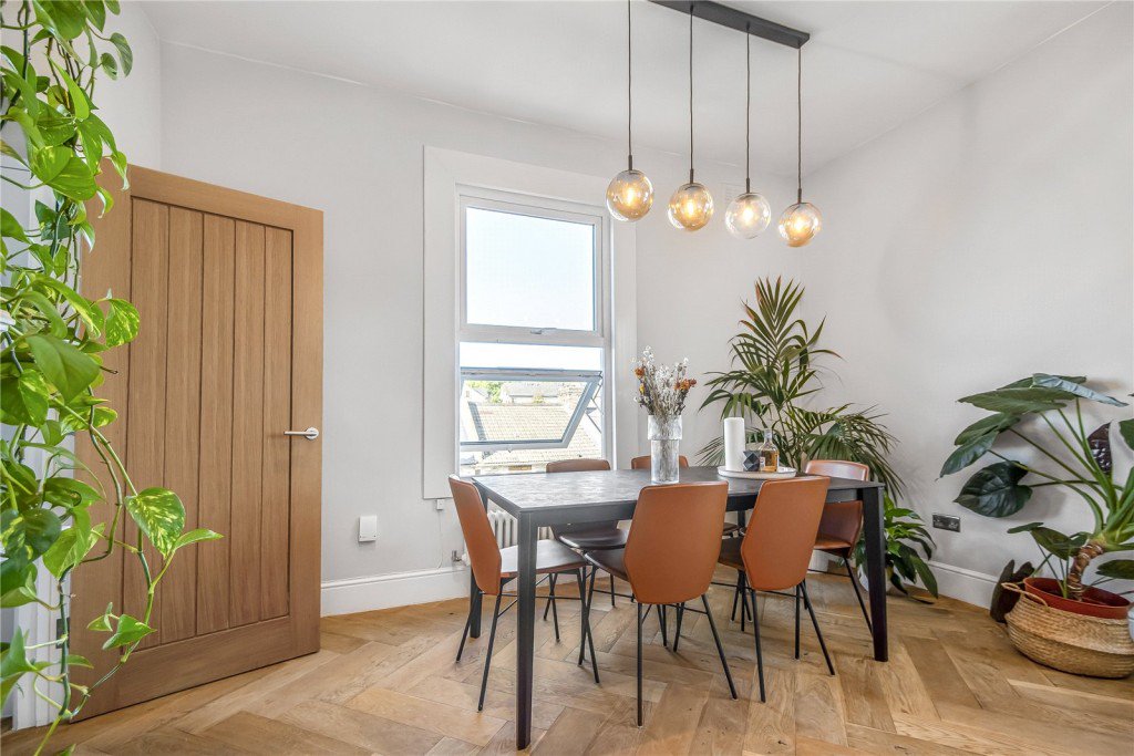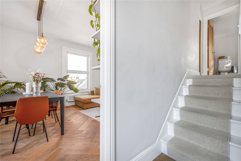 As you enter the flat on the first floor, there is a landing area with useful storage cupboards. You are then greeted by a spacious reception room with ample space for dining and entertaining. This room boasts a feature fireplace, herringbone flooring and high ceilings.