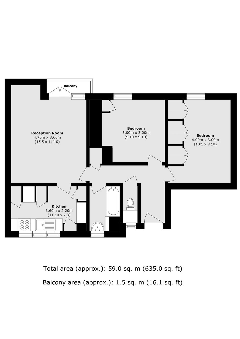 A spacious, two bedroom flat with a separate kitchen and a private balcony space. This property offers a generous reception area with large widows for plenty of natural light and wooden flooring. Both double bedrooms provide ample space and built in storage.