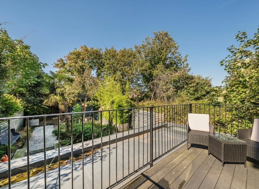This charming property boasts a generous front reception room featuring high ceilings, an original fireplace, ornate cornicing, and a large bay window that floods the space with natural light. The fully integrated kitchen opens directly onto a private roof terrace.