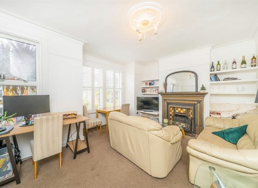 The accommodation comprises a spacious front-facing reception room featuring an original fireplace and a charming bay window, a separate modern kitchen fitted with a range of integrated appliances, three well-proportioned double bedrooms, and two stylish bathrooms.
