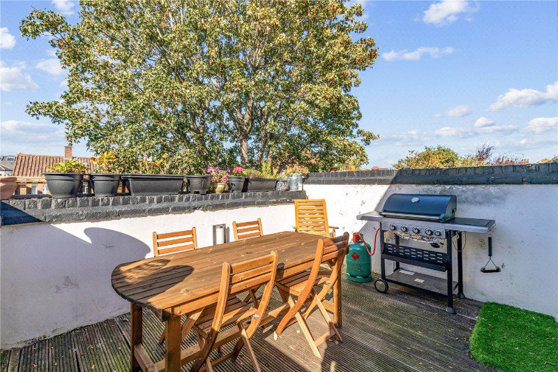 This spacious three-bedroom upper-floor maisonette features a bright reception room with engineered wood flooring and a feature fireplace. The kitchen includes tiled flooring, a range of wall and base units with stylish brown countertops, and a tiled splashback. Double doors open onto a private decked terrace, providing an ideal space for relaxing or entertaining guests.