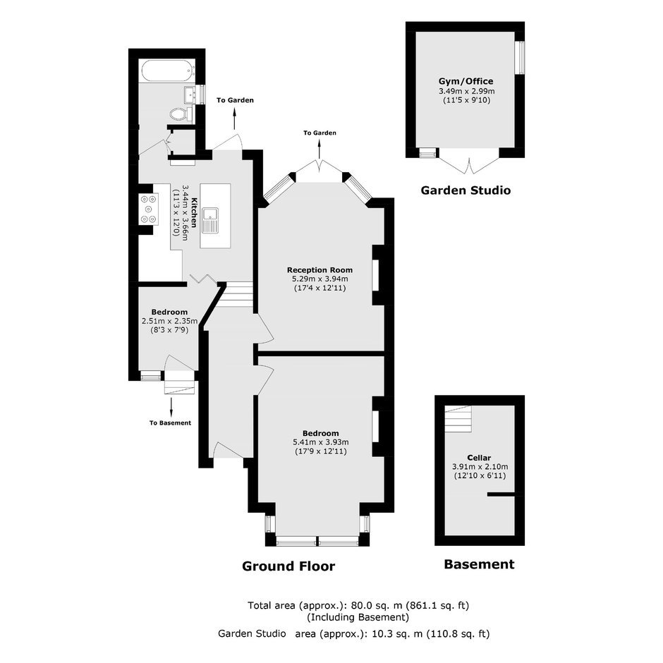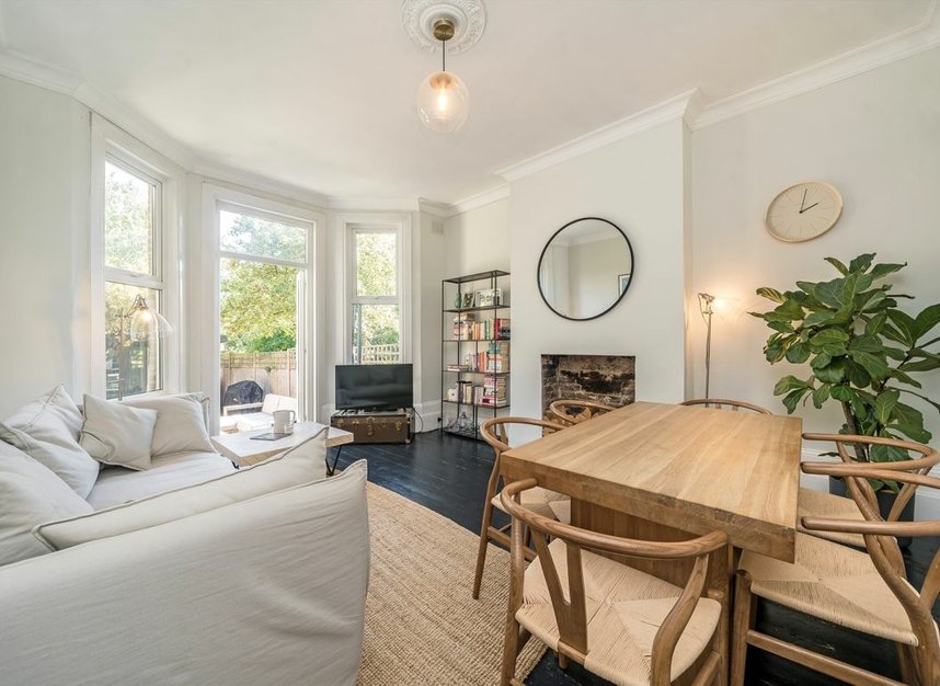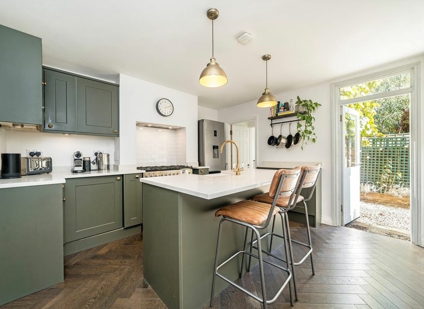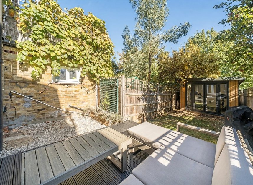 Stylish ground floor flat with two double bedrooms, renovated kitchen with Rangemaster cooker, private garden with decking and versatile studio, ideal as a gym or home office. Immaculately presented, with a share of freehold, blending modern style and original features.