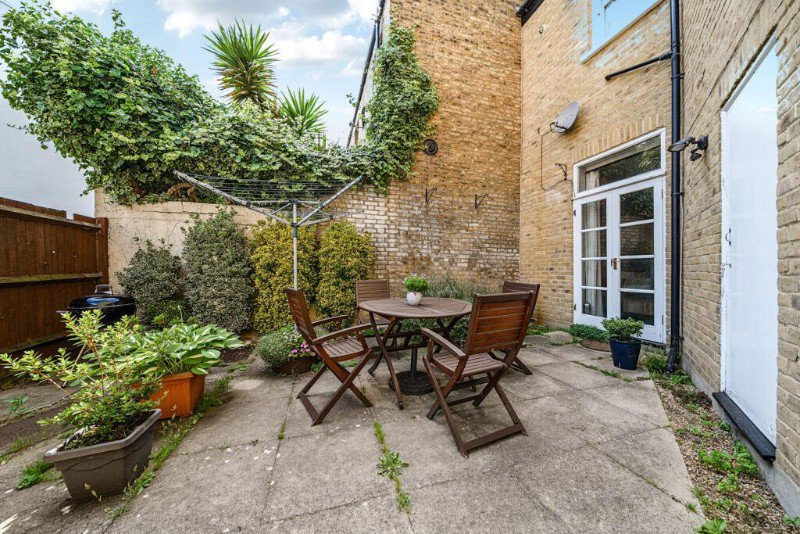 Step inside to a light-filled reception room featuring wood flooring, soft grey tones, and French doors opening directly onto a charming private patio garden — perfect for relaxing or entertaining. The smart, contemporary kitchen includes wooden worktops, crisp white cabinetry, and pastel-toned tiling, creating a bright and welcoming cooking space.
