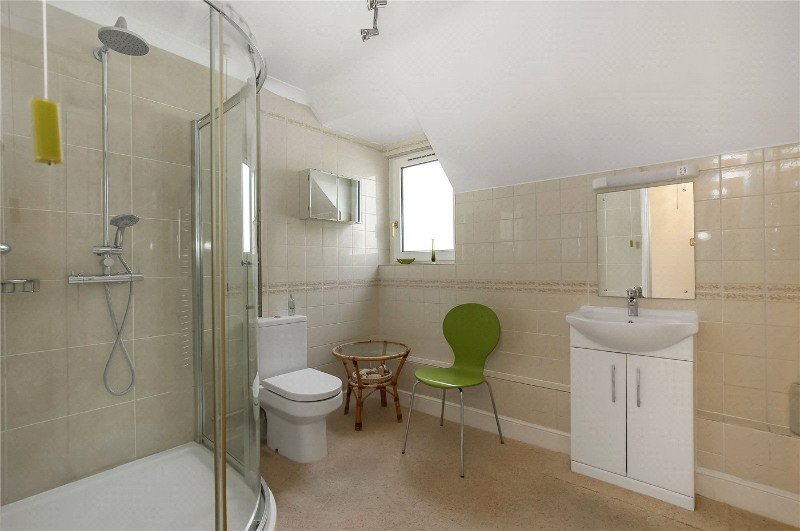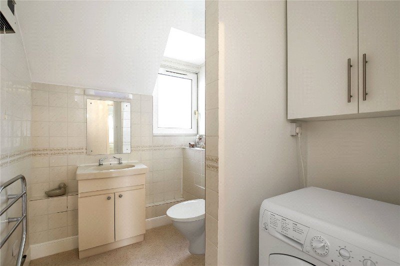The separate kitchen is fitted with wooden units, tiled splash backs, waste disposal unit, and kick board heater, and offers space for modern appliances, with twin windows providing pleasant rooftop views. There are two well-proportioned bedrooms, each bright and neatly presented, with the principal bedroom having ample room for free-standing wardrobes. The modern shower room is finished in neutral tones with a curved glass enclosure and a white vanity unit. Additional separate W.C./utility room with further storage.