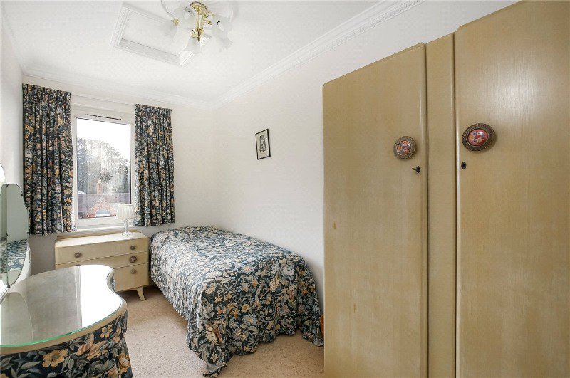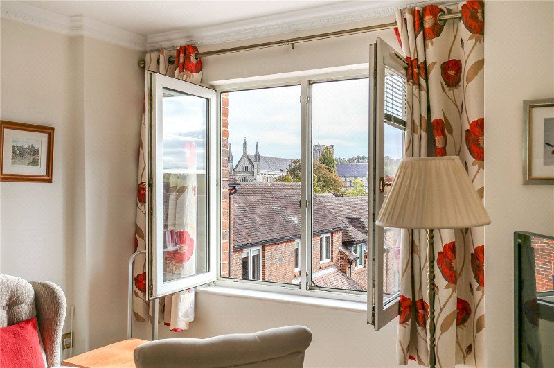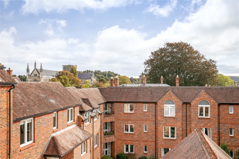 A bright and well-proportioned top floor two-bedroomed apartment (with allocated parking space) forming part of an assisted living development, ideally suited to those seeking independence with the reassurance of on-site support and a friendly community atmosphere. The apartment is accessed via a secure communal entrance and benefits from a thoughtfully arranged layout. The generous living room enjoys excellent natural light through a large window and provides ample space for both seating and dining areas. In the living room there is a traditional fireplace which adds a touch of character, while the room also benefits from delightful views towards the cathedral. The apartment further benefits from a sunny balcony and an outside storage cupboard, enhancing its practicality and appeal.