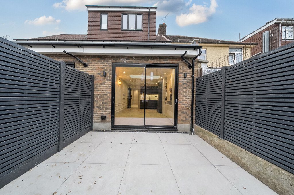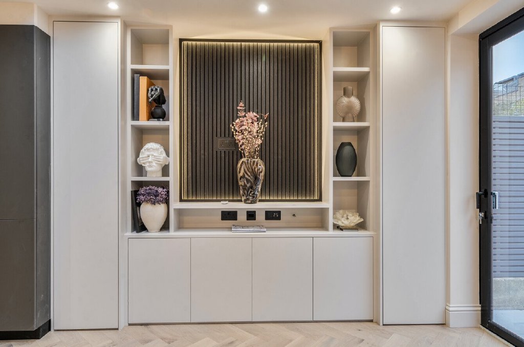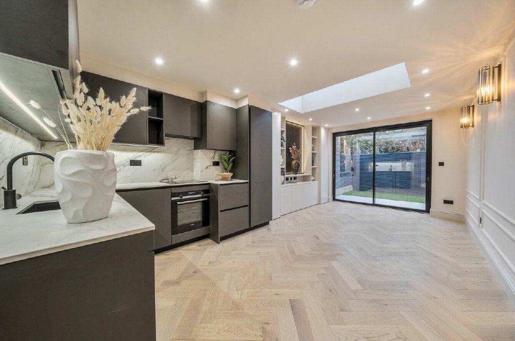 The bright and spacious open-plan kitchen, living, and dining area features an Italian-designed kitchen with Siemens appliances and bespoke joinery. Bi-fold doors open onto a beautifully landscaped garden, creating a seamless indoor-outdoor living experience.