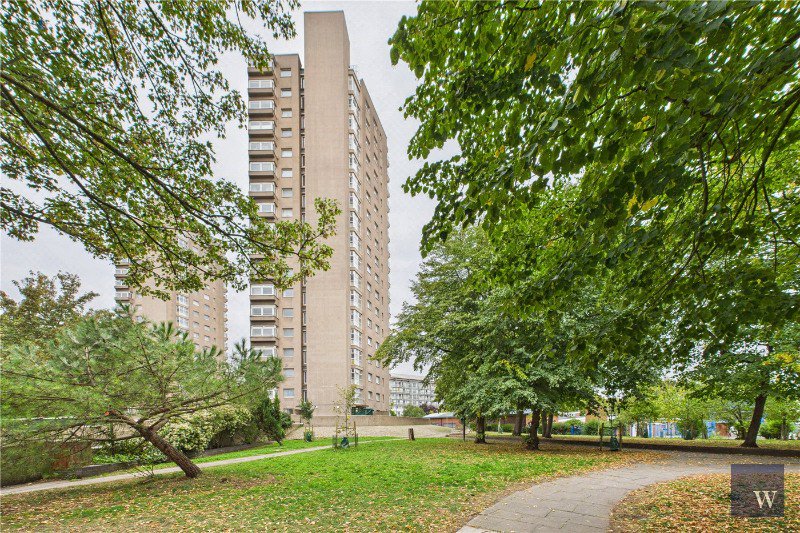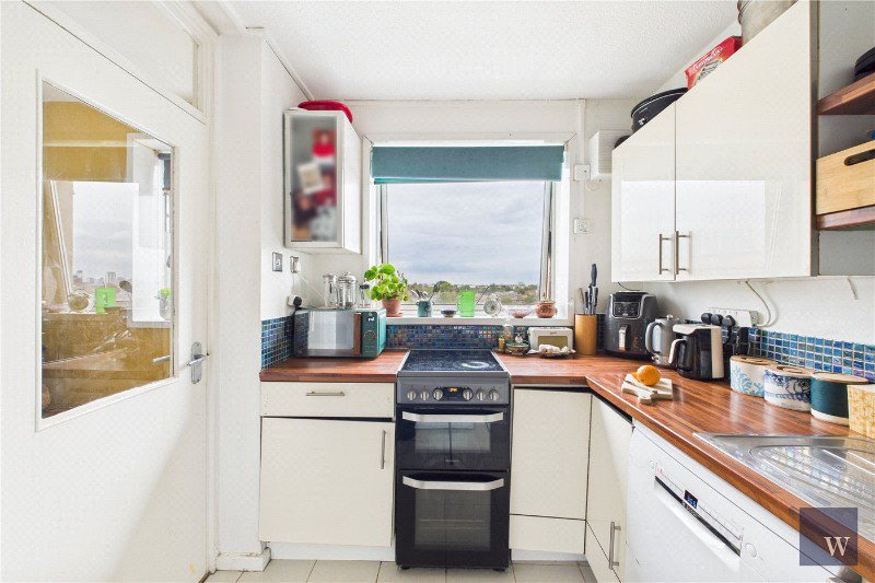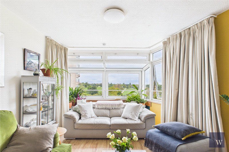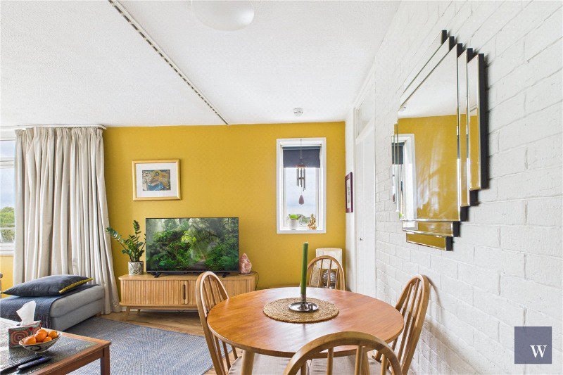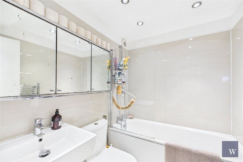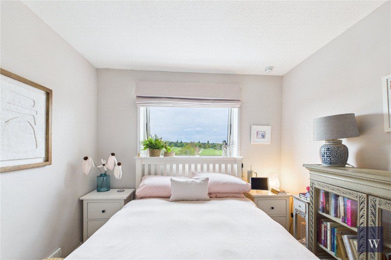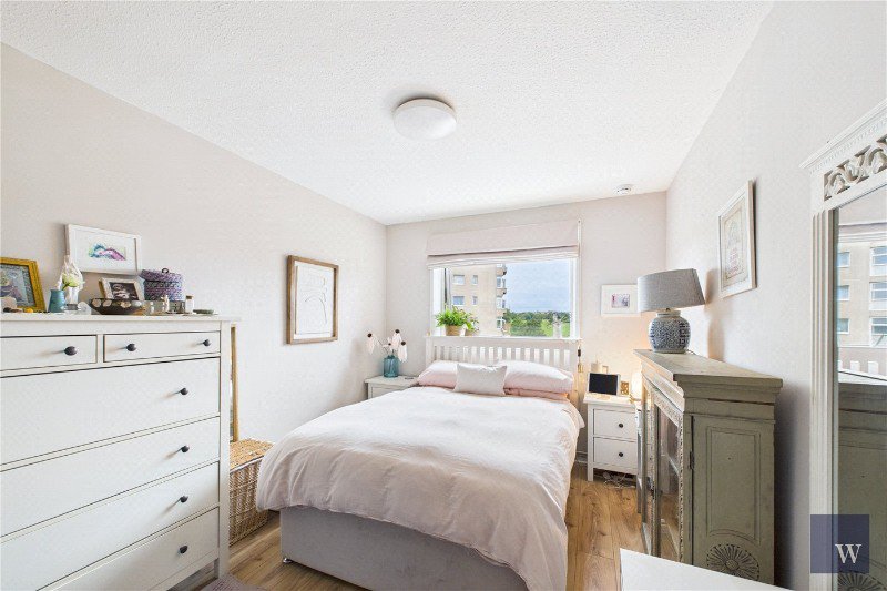 The double bedroom is calm and well-proportioned, benefiting from fitted wardrobes and that same leafy outlook. A modern bathroom sits off the hallway with a shower-over-bath and mirrored storage. Throughout, large picture windows draw in natural light and make the most of the flat’s elevated position.