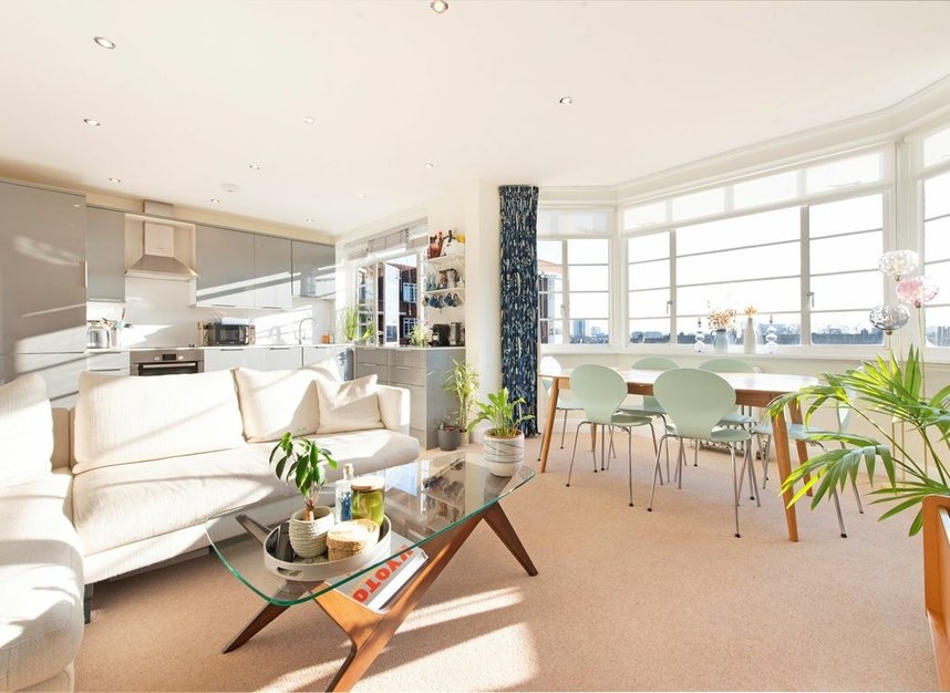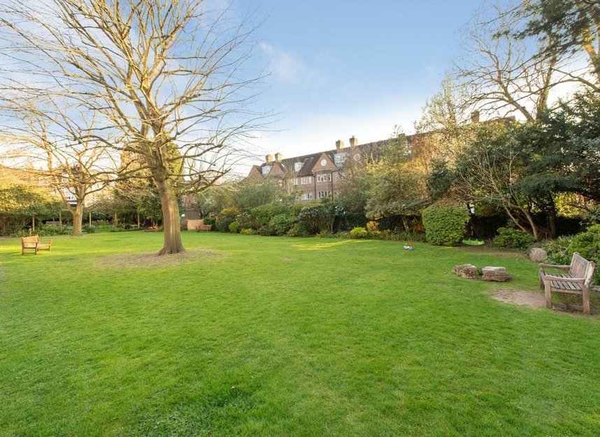 An exceptionally bright and spacious two bedroom, two bathroom apartment arranged over the fourth floor of this popular mansion block in the heart of Belsize Park. Large west facing windows allow a huge amount of light into the whole property and give amazing views out to the communal gardens and skyline of Belsize Park.