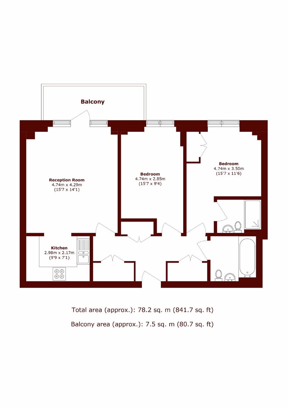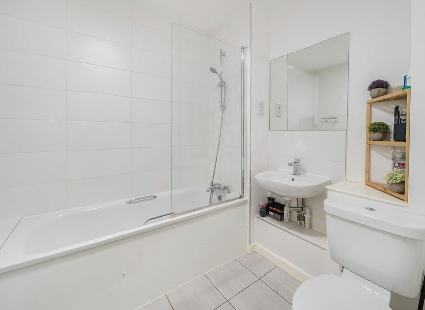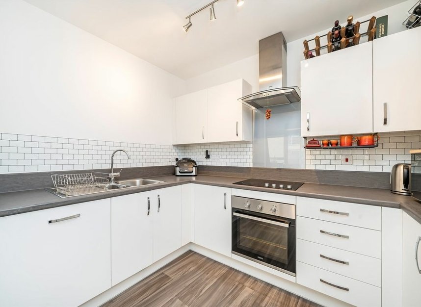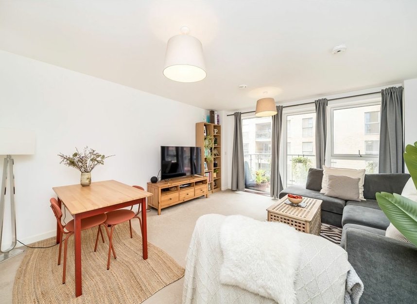 A well-proportioned two-bedroom apartment measuring just under 850 sq ft, featuring two double bedrooms, two modern bathrooms, a sleek kitchen with generous storage and integrated appliances, and a spacious open-plan living and dining area that opens onto a private balcony. Offered chain-free with a long lease.