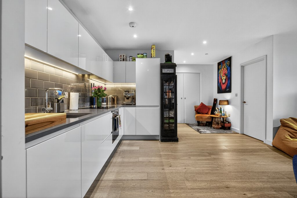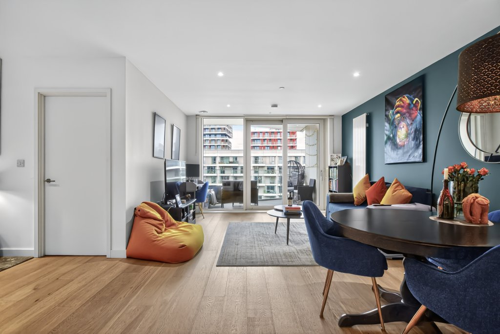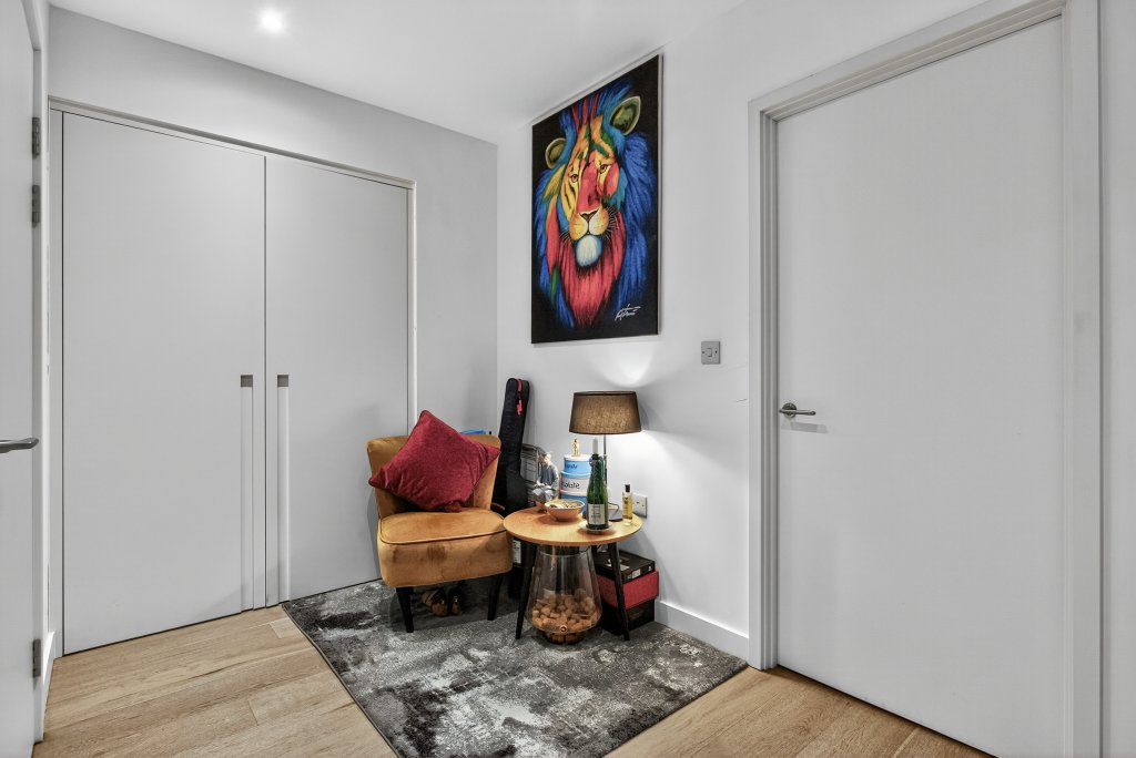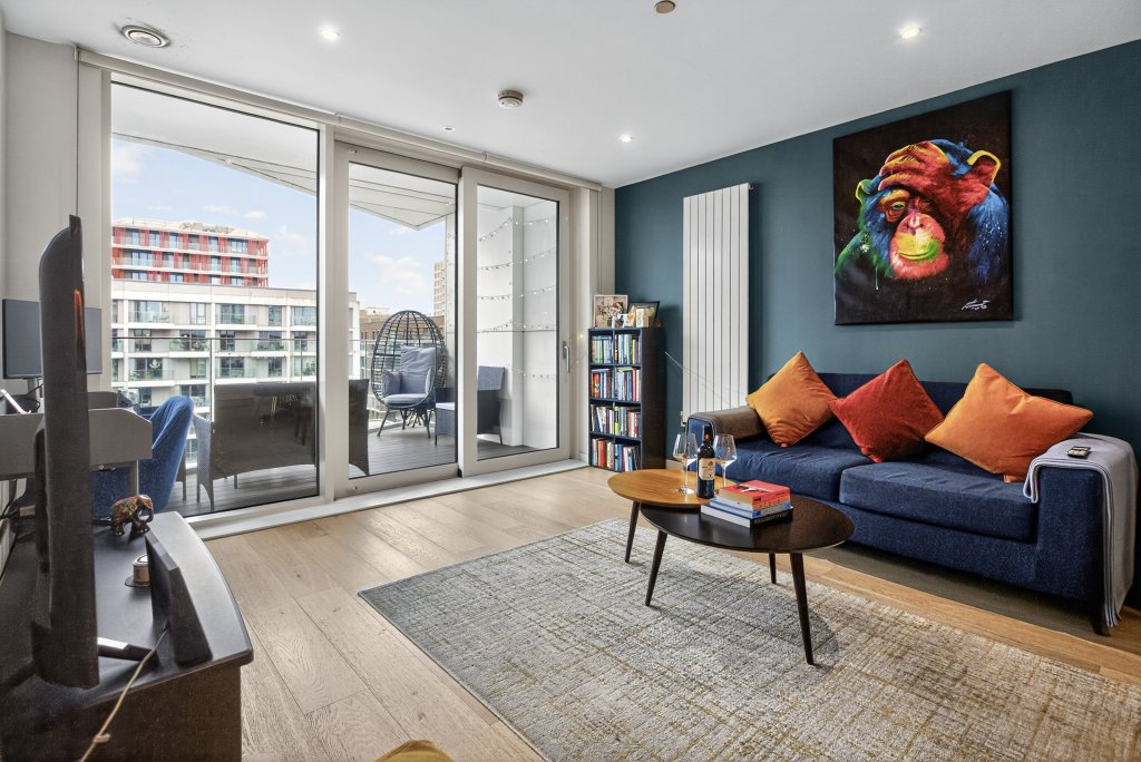 A beautifully presented and generously proportioned one-bedroom apartment, located on the top floor of the sought-after Carrick House development within the prestigious Royal Wharf neighbourhood. Offering 665 sq. ft. of stylish living space, this apartment boasts modern design, premium finishes, and outstanding local amenities — making it ideal for professionals, first-time buyers, or investors alike. The highlight of this property is its west-facing, covered balcony with stunning views of the River Thames, perfect for enjoying the afternoon and evening sun. The open-plan kitchen/living area features a striking feature wall, setting it apart from other apartments in the development, while large windows flood the space with natural light. The modern kitchen includes integrated appliances and ample storage, creating a sleek and practical space for entertaining. The spacious double bedroom benefits from built-in wardrobes and access to a unique cove space between the bedroom and bathroom, ideal for use as a study or dressing area. A contemporary bathroom and additional hallway storage complete the interior. Residents of Carrick House enjoy access to a range of exclusive on-site amenities, including a gym, swimming pool, restaurants, cafés, nurseries, schools, and landscaped communal areas. The development also benefits from 24/7 security and concierge service. Ideally situated for commuters, the apartment is just a 5-minute walk to Royal Wharf Pier (Uber Boat) and less than 10 minutes to Pontoon Dock and West Silvertown DLR Stations, with Custom House (Elizabeth Line) reachable in approximately 15 minutes — providing fast and easy connections into Canary Wharf, the City, and beyond. With a large riverside park and regular local food markets nearby, this stunning apartment perfectly combines modern urban living with a sense of community and relaxation.