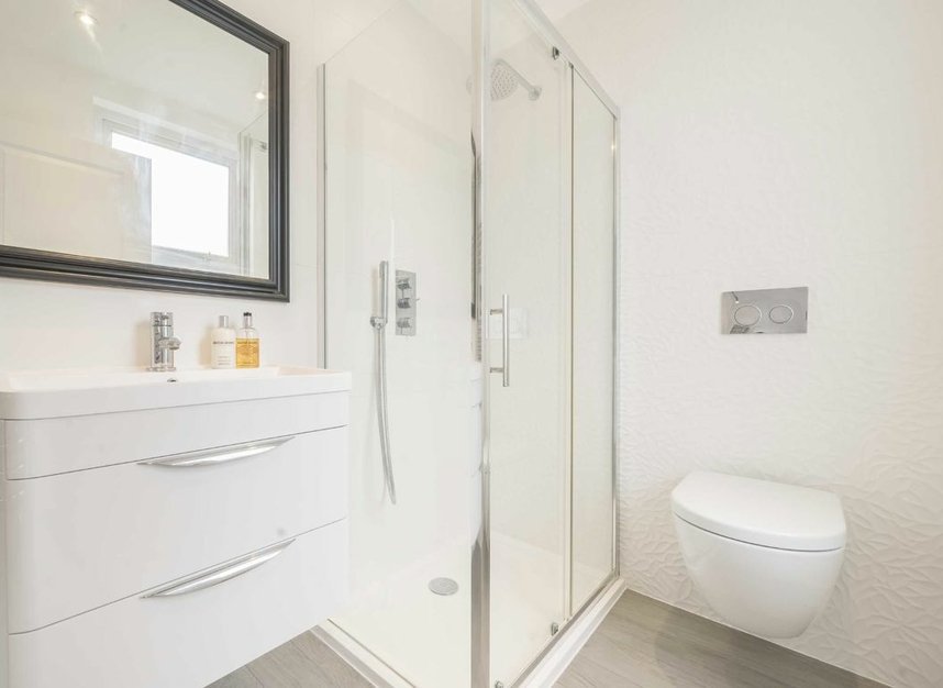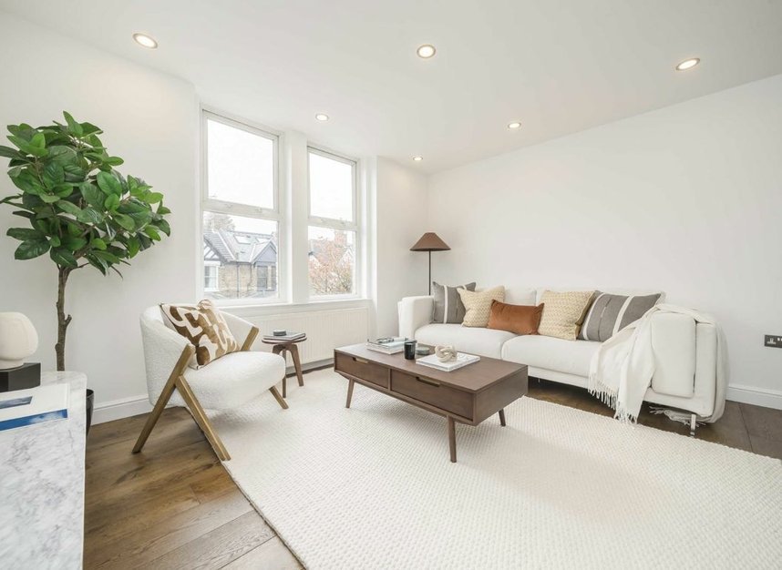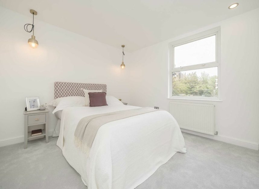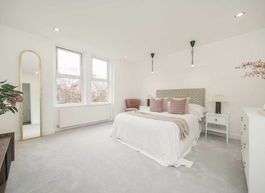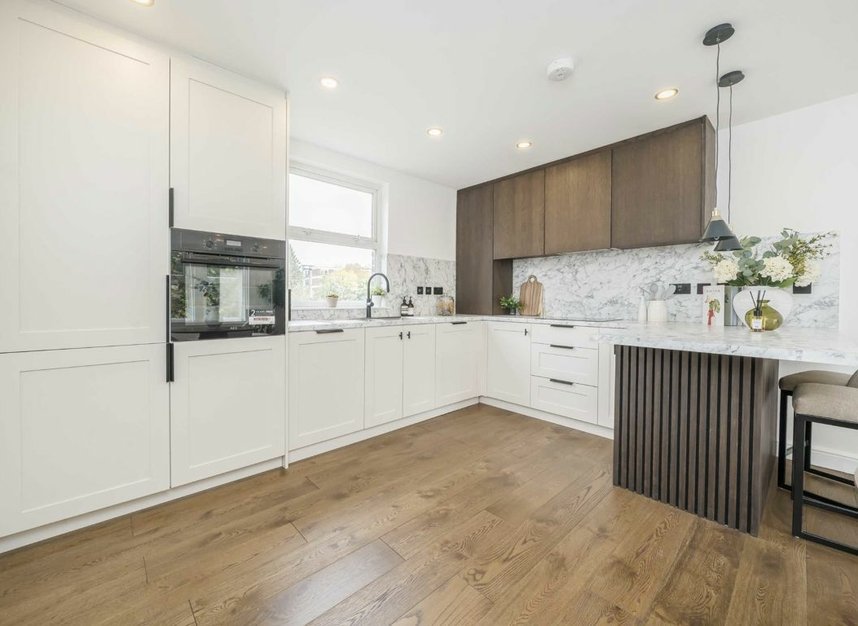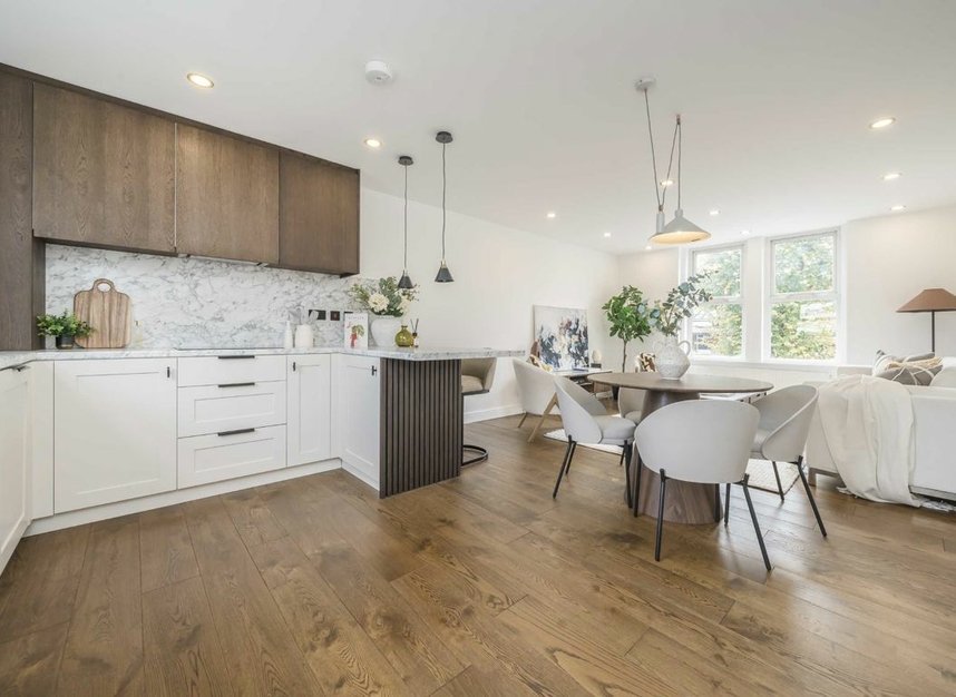 A beautifully modernised two-bedroom, two-bathroom first-floor flat that occupies the entire first floor. The property features a bright and spacious open- plan living and kitchen area with dual aspect large windows offering abundant natural light. It includes two generous double bedrooms, a sleek en-suite shower room, and a contemporary family bathroom. The property also boasts a large private garden and comes with no onward chain and a share of the freehold.