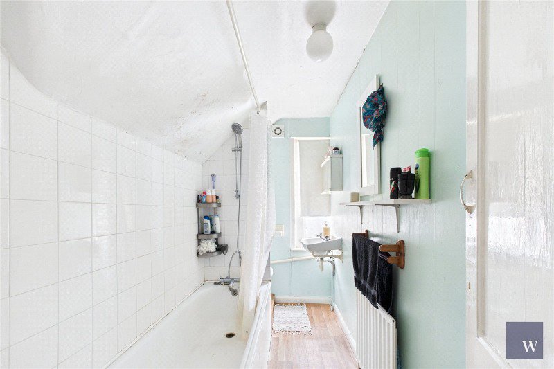 The double bedroom is particularly spacious, complete with fitted wardrobes and pleasant natural light, while the bathroom is neatly presented with a full-sized bath and overhead shower. A large roof space off the hallway offers excellent potential (STPP) to be converted into a bathroom, while the main loft provides substantial further potential for conversion into bedrooms or a large storage area.