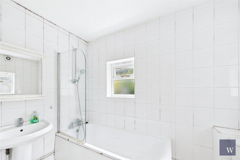 There are three bedrooms in total — the principal room sits at the front with a broad bay window and excellent natural light, a further double lies to the rear, and a third bedroom offers flexibility as a study or guest room. The bathroom is neatly finished with a full-size bath and overhead shower, while a small basement area provides useful additional storage.