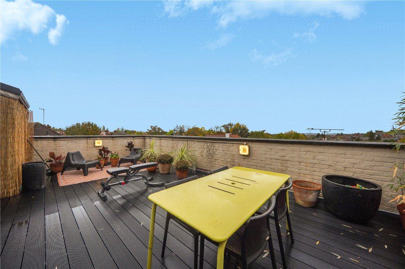Situated within just 0.2 of a mile from the green spaces of Oliver Tambo recreation grounds is this truly superb and very spacious 1097 sq.ft / 101.9 sq.m three-bedroom, split level, top floor, modern apartment boasting an impressive 27 x 16’5 ft private roof terrace with pleasant roof top views and off-street parking.