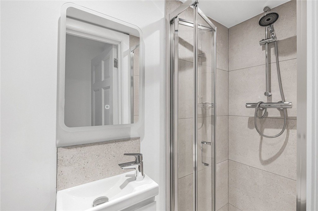 The property comprises two well-proportioned double bedrooms, including a principal bedroom with a contemporary en-suite shower room. A second modern shower room is conveniently located off the hallway. The open-plan kitchen and reception area is bright and spacious, ideal for both everyday living and hosting guests. Large glass doors at the rear of the property open directly onto the private garden, allowing for seamless indoor-outdoor living.