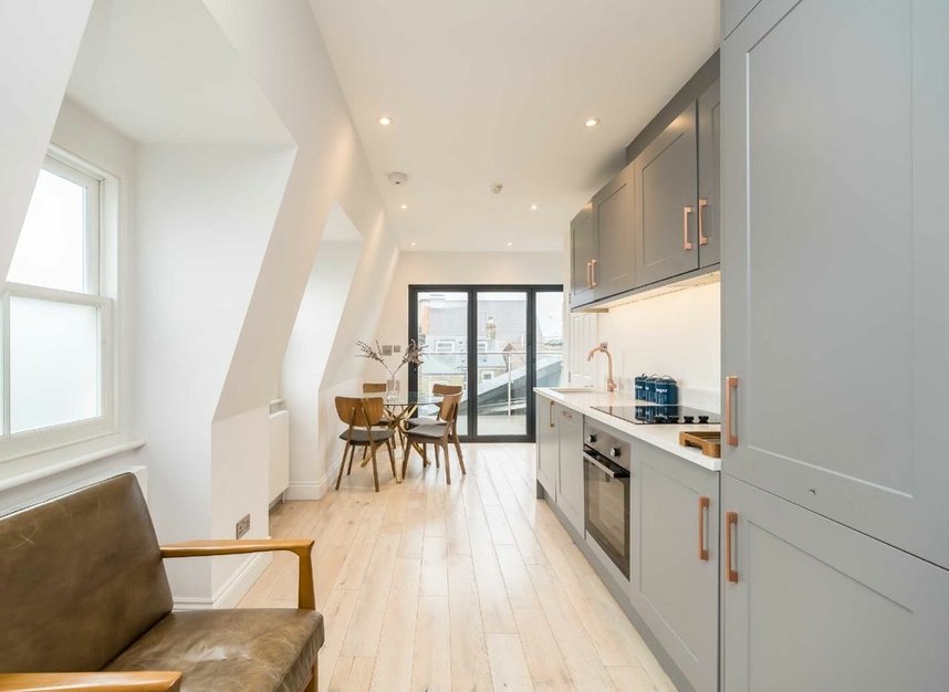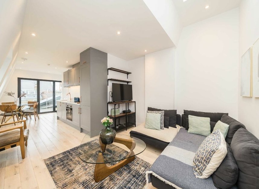 A beautifully presented top-floor apartment set on the highly sought-after Latchmere Road. The accommodation offers a spacious open-plan reception and kitchen, two well-proportioned double bedrooms, and a sleek modern bathroom. To the rear, a private roof terrace provides far-reaching views across London, creating the perfect spot to relax or entertain. Further benefits include the property being offered chain free.