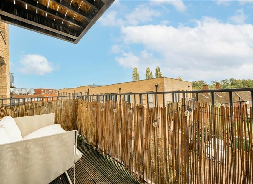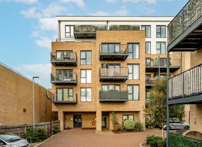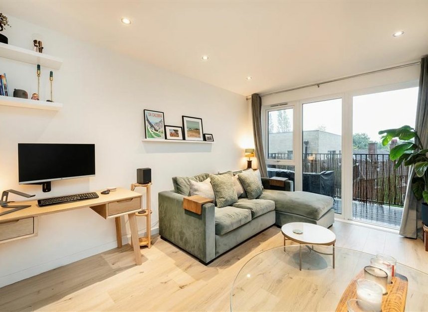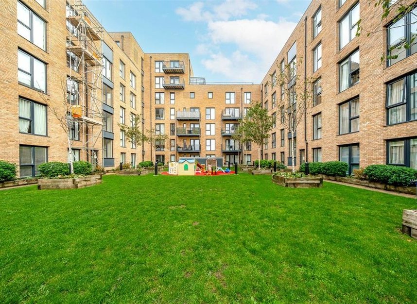 Situated on the second floor of a recently built development, this one bedroom flat boasts an open-plan reception with family kitchen leading on to a private balcony, a large twin bathroom and ample storage cupboards. The property benefits from a communal garden.