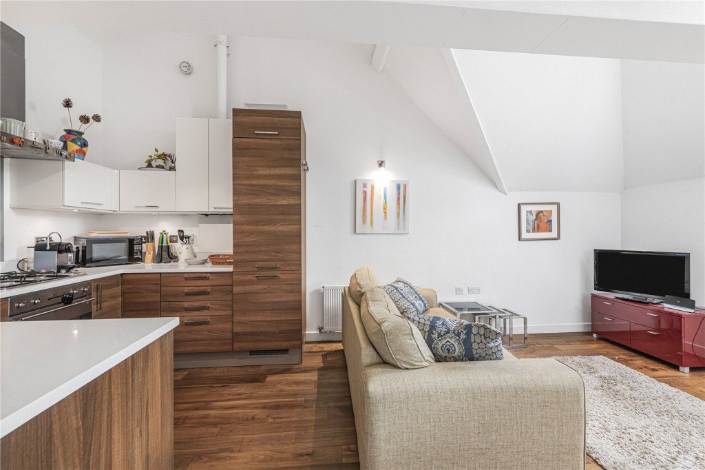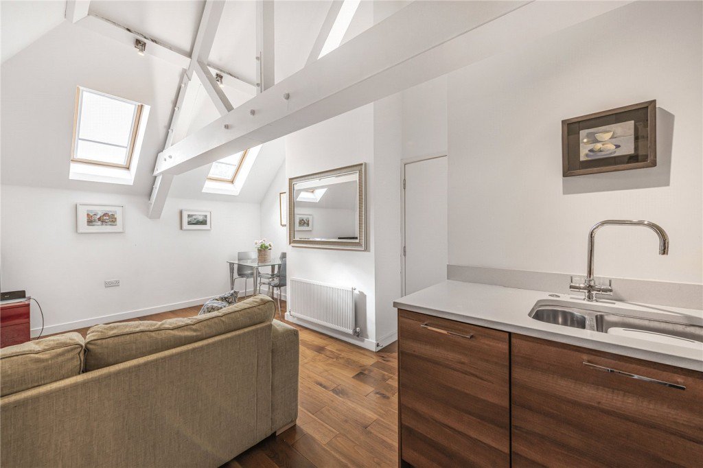 A beautifully presented and generously proportioned one-bedroom apartment set on the first floor of this sought-after modern development. The property offers a bright open-plan kitchen and reception area, a spacious double bedroom, and a contemporary bathroom. The flat is presented in excellent condition throughout and features distinctive vaulted ceilings that add a unique sense of character and space. Additional benefits include a private, secure parking space.