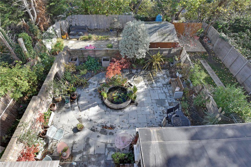 A beautifully proportioned, split-level garden flat with flexible three bedroom accommodation and a private, landscaped garden. Spanning about 1,395 sq ft / 129.6 sq m, the layout celebrates volume and light, flowing from an elegant bay-fronted living room (17'3 x 16'3) into a separate dining space (16'3 x 13'6) and a striking garden room beneath twin skylights. The kitchen is smart and practical (14'3 x 7'9), while the statement bath/shower room and separate WC add a touch of luxury. Two generous bedrooms sit on the raised ground floor (16'9 x 12'3 and 11'6 x 9'9), with stairs down to a further naturally lit room on the lower level (13'6 x 7'3) that makes an ideal study, studio or occasional third bedroom. Outside, the private garden is a serene extension of the living space, thoughtfully hard-landscaped with broad terraces, planted borders and an ornamental pond, measuring roughly 33' x 30'. There is off-street parking to the front and the property is Share of Freehold within a small, well-kept building of just three homes
