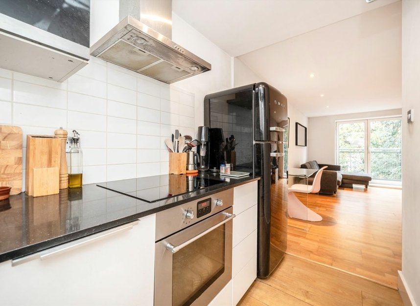An immaculately presented, modern one bedroom apartment set on the second floor, with an open plan kitchen and living area, wooden flooring and integrated appliances.