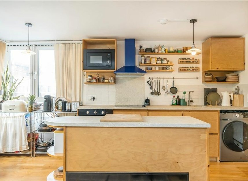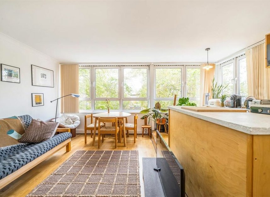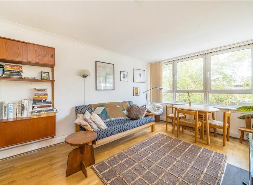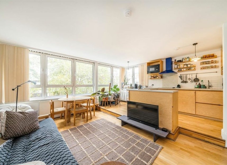 A well presented, split-level apartment, originally designed by an architect, the apartment has been thoughtfully arranged to maximise space and functionality. The property offers a large open-plan kitchen and living area and benefits from large west-facing windows with views over the communal gardens. The contemporary kitchen features Art Deco-inspired plywood cabinetry and a practical central island. Both double bedrooms are generously sized with built-in wardrobes, while the recently refurbished bathroom features a luxurious rainfall shower.