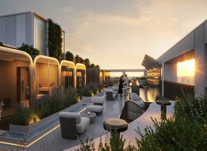 Designed with a focus on wellbeing and sustainability, the building embraces intelligent, future-forward architecture and green design principles. Residents enjoy access to a state-of-the-art fitness and wellness centre, private cinema, co-working lounges, and the crown jewel - a tranquil rooftop retreat with breath taking sunset views over London.