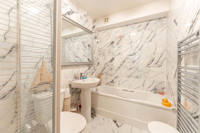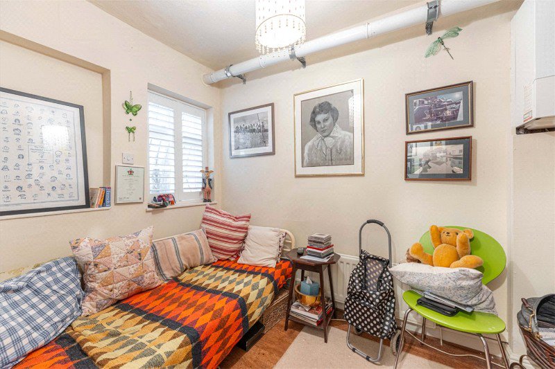 The principal bedroom is a spacious double with windows overlooking the private courtyard and an excellent range of built-in wardrobes and storage. The second bedroom, located opposite, is ideal for guests or a home office. Between the kitchen and second bedroom sits a useful utility room, offering exciting potential for reconfiguration or incorporation into one of the adjoining rooms.