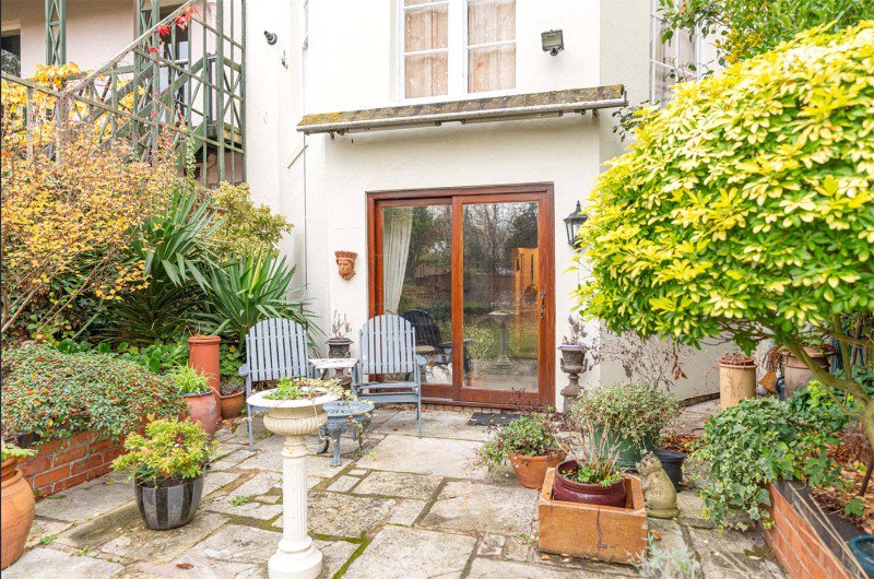 Offering rare outside space for a property of this type – including its own private entrance, a beautifully mature private garden, and an extraordinary double garage – this chain-free home combines period elegance with town-centre convenience.