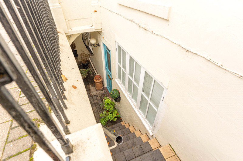 Accessed via private steps from Portland Place West, the property opens into a charming courtyard with useful external storage housed in the original wet cellars. From here, the private front door leads into a welcoming entrance hallway that thoughtfully separates the living spaces to the rear from the bedrooms at the front.