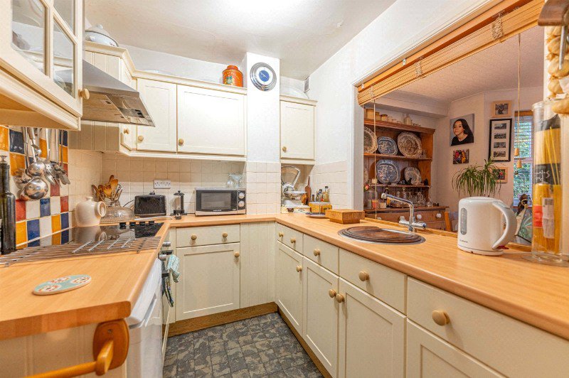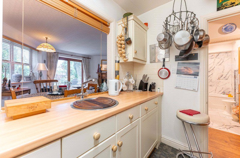 Adjacent to the reception room is a traditional U-shaped kitchen benefitting from plentiful storage, generous worktop space, and integrated appliances. The kitchen is fully functional but would reward a sympathetic update to make the most of its connection to the living space.