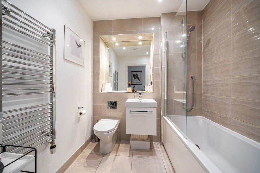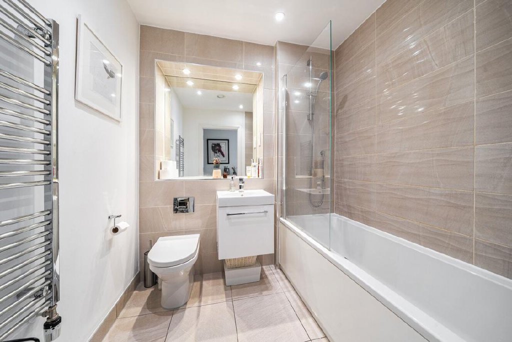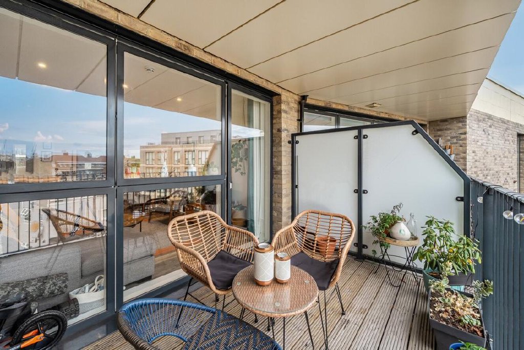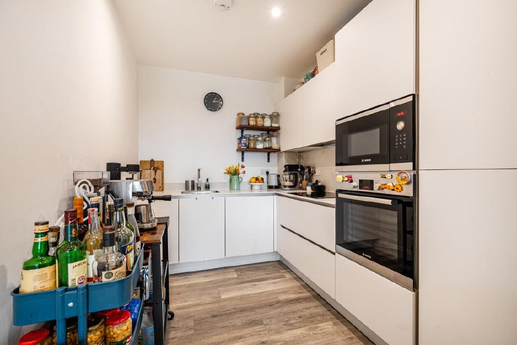This contemporary one-bedroom apartment sits on the top floor of a sought-after development. The open-plan living area offers plenty of to entertain, while the sleek modern kitchen features handleless white cabinetry, quartz worktops, and integrated appliances. Floor-to-ceiling windows flood the space with natural light and lead out to a generous balcony.