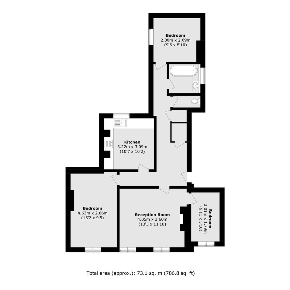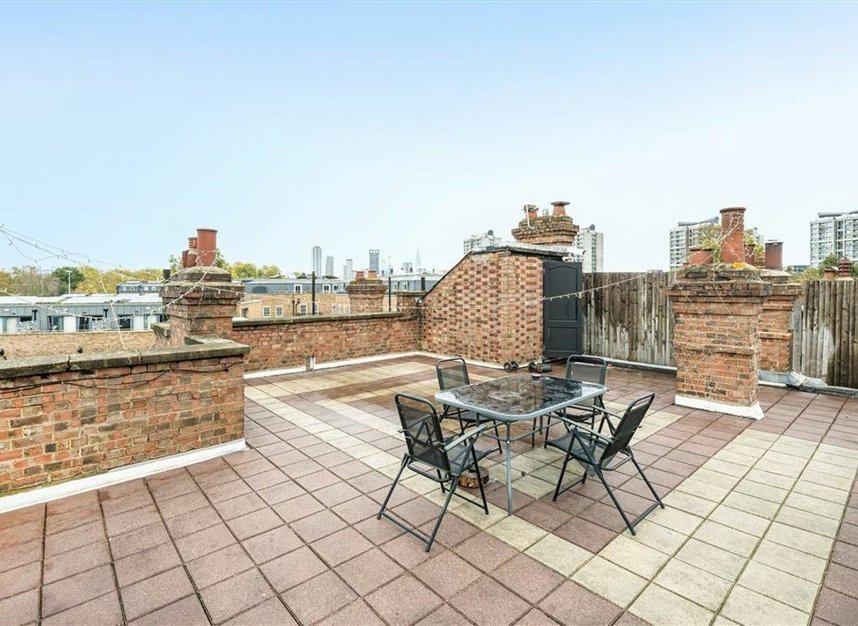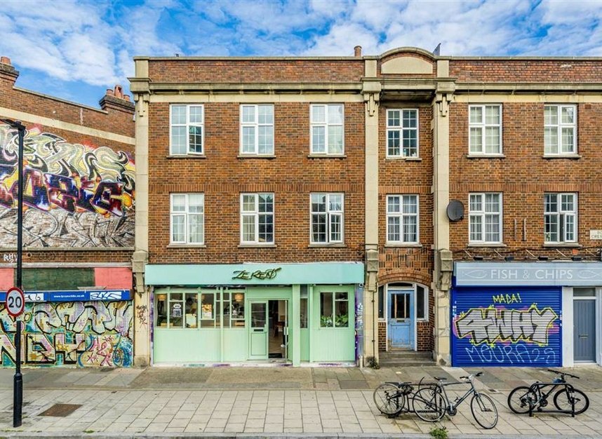 A bright three bedroom apartment, measuring at 786 square ft. To the front there is a charming living room, complete with a woodburner and rustic hardwood flooring, and a bedroom which makes for a perfect office space. Through the hall, there is a large separate kitchen/dining area and double bedroom. At the far end of the property a bathroom and separate w/c and a further second bedroom. This flat has sole access to an incredible roof terrace, which spans over the entire roof.