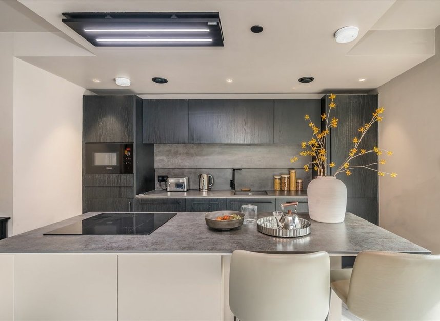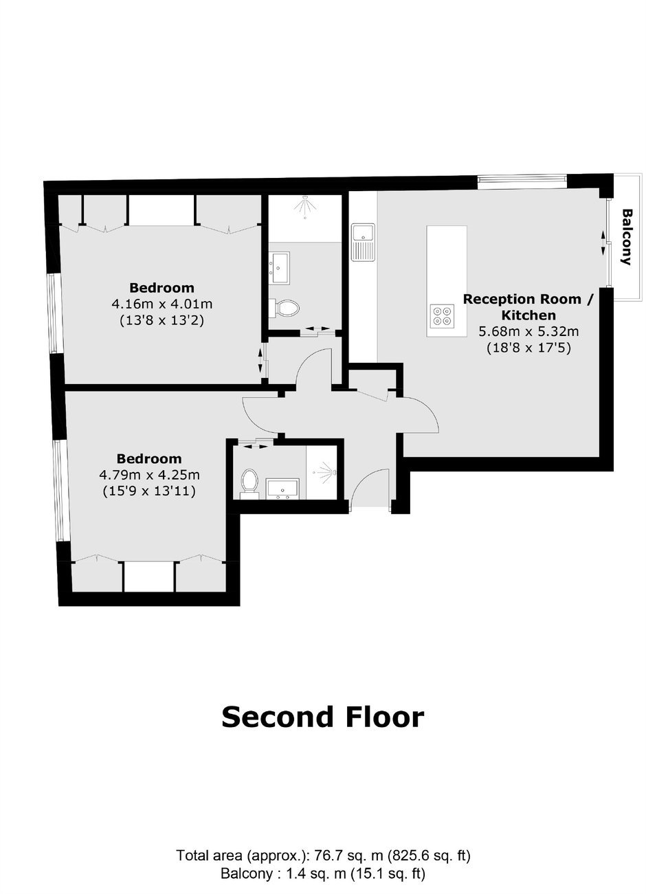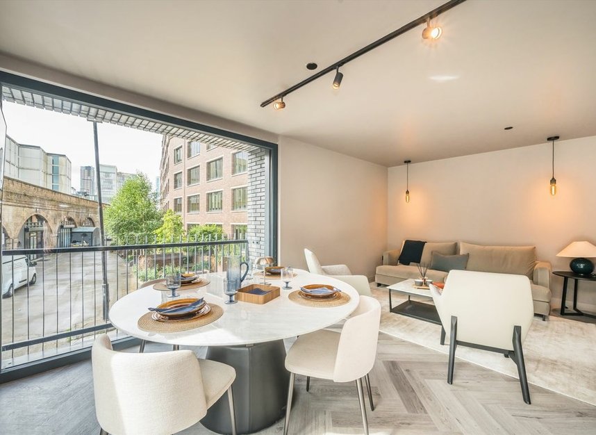 A stunning 2-bedroom, 2-bathroom apartment on the first floor of a modern industrial-style development. Spanning 860 sq ft, it features lift access, two private balconies, lime-washed wooden floors, and large triple-glazed windows flooding the space with natural light. The open-plan kitchen includes bespoke Neolith surfaces and an island with extractor hood, while bathrooms are finished with premium fittings. Both bedrooms have fitted wardrobes, built-in LG TVs, underfloor heating, and integrated blinds. *Images may be of show flat