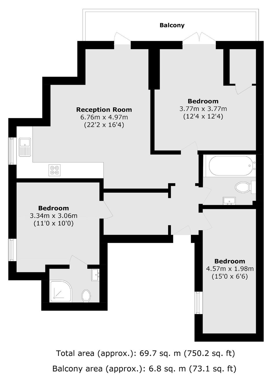 A first floor three bedroom apartment with two bathrooms, an open plan living area with a well-fitted kitchen, and a private balcony. Offered with a long lease and no onward chain.