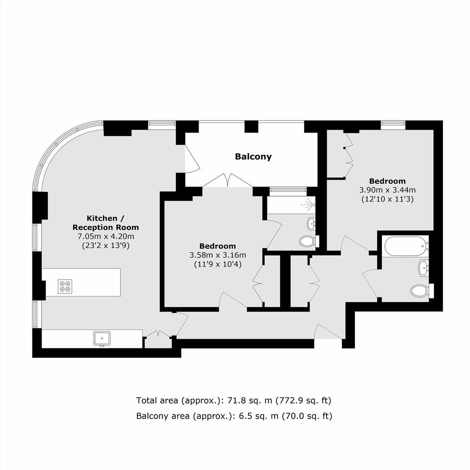 Located within a modern development, a spacious two bedroom, two bathroom apartment finished to a high specification throughout. The apartment also has a private balcony, and comes with a share of the freehold.