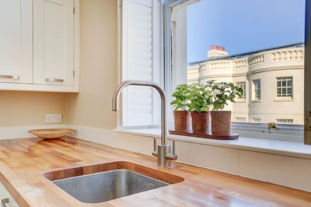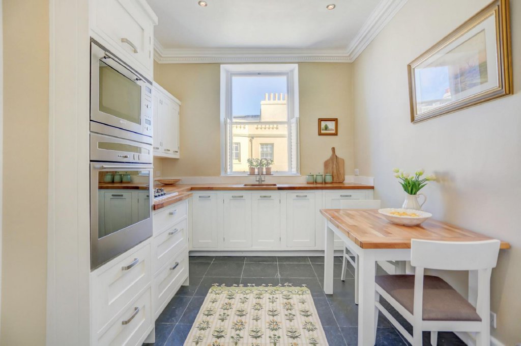 The separate kitchen overlooks the charming Brunswick properties at the corner of Holland Road. Fitted with Neff appliances including a gas hob, the kitchen features modern white cabinetry offset by solid wood worktops and a soft antique taupe décor, blending contemporary convenience with country-style warmth.